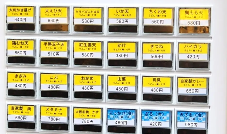 ボタンを拡大するとこんな感じです。上の4段が、ベースとトッピングがセットになったフルメニュー。例えば「大判かき揚げ」のボタンは「大判かき揚げの載った麺」ということで640円(税込)です。