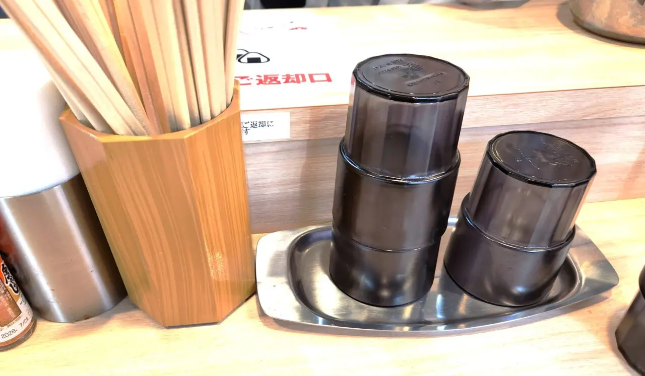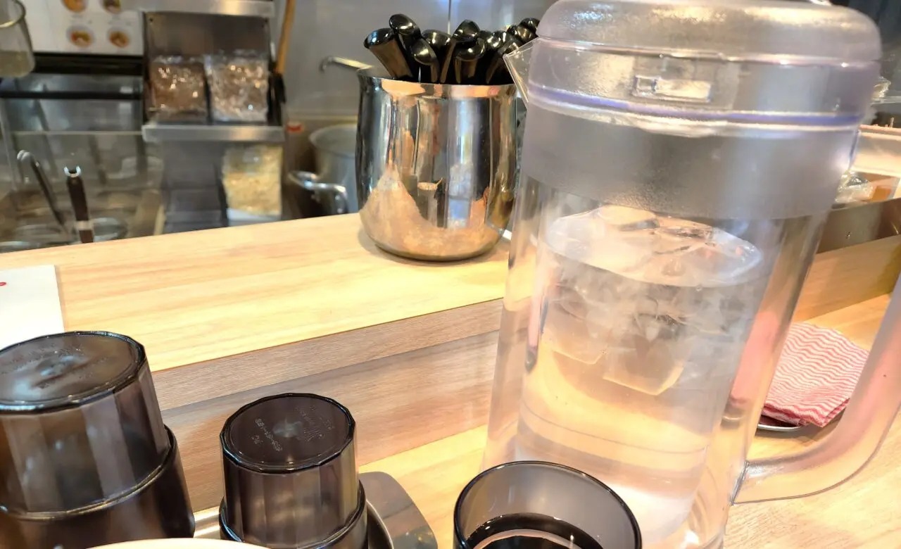 カウンター上にはコップや薬味、お箸、ナプキンがあり、いずれも大変清潔でした。キリッと冷えたウォーターポットがすぐ手の届く所にあり自由に飲めます。