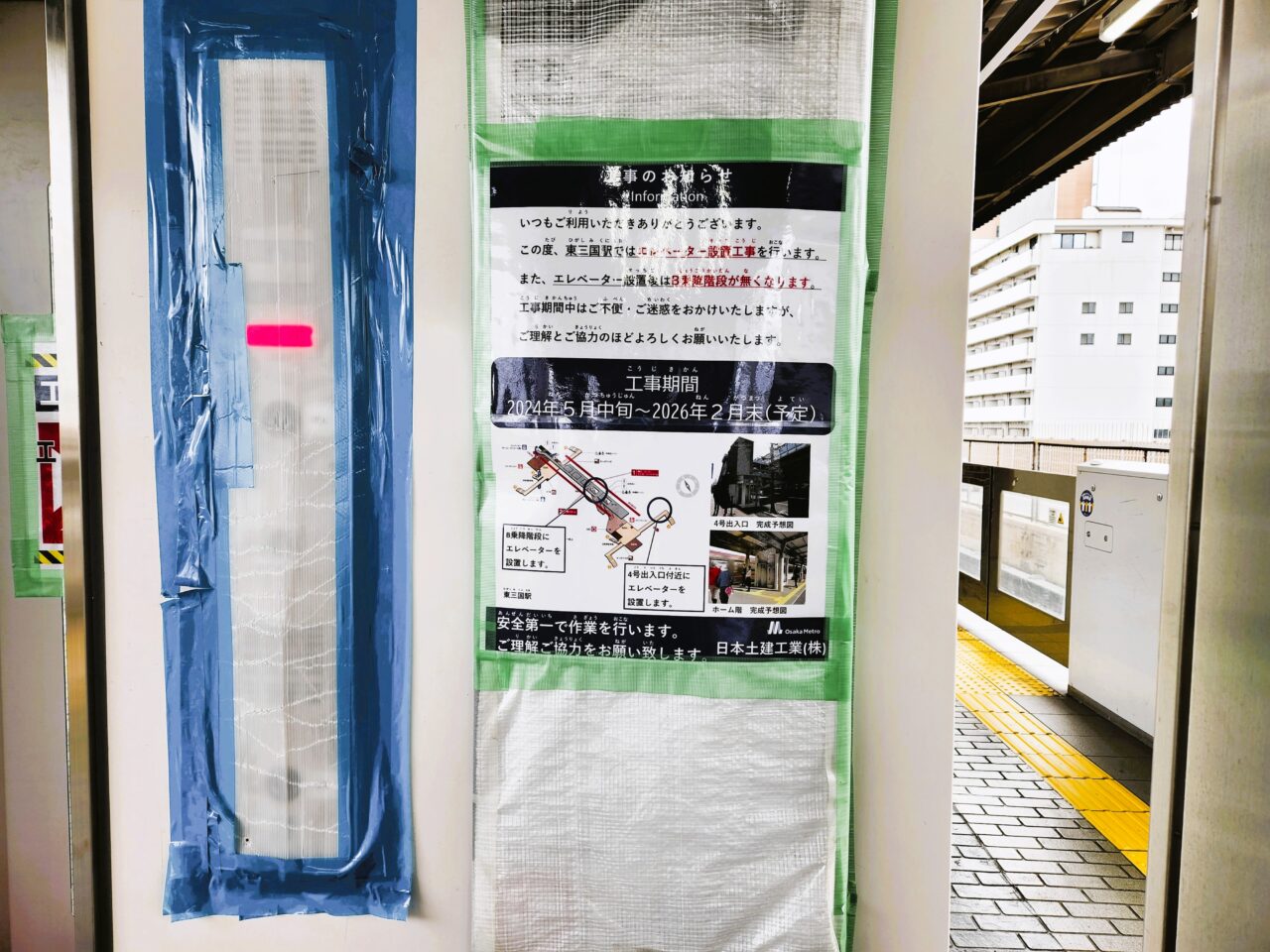 【大阪市淀川区】便利!大阪メトロ御堂筋線東三国駅、B乗降階段近くで工事中だったホームへの『乗降用エレベーター』が、2月27日(金)始発から使用開始に♪