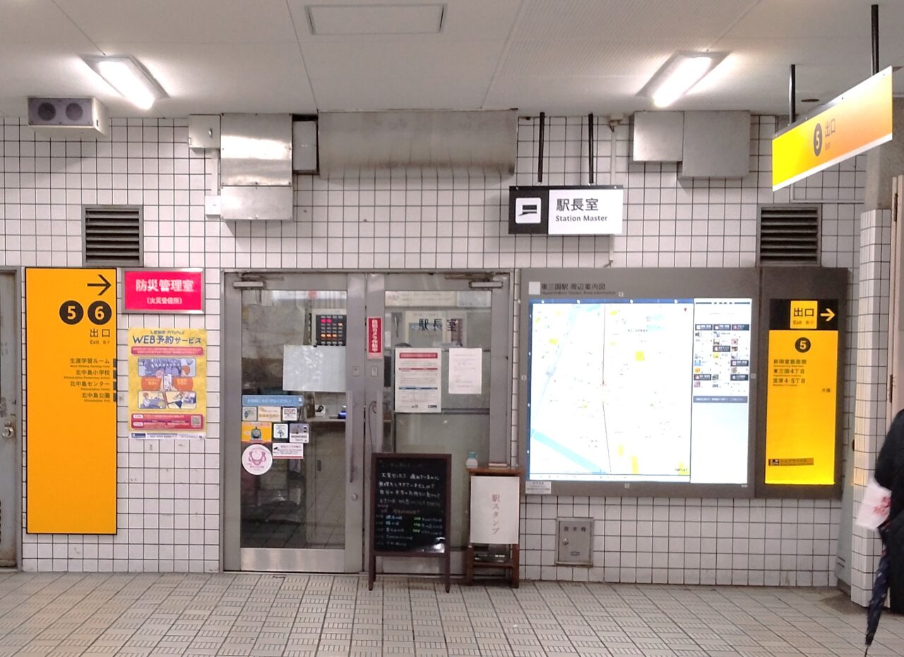 動くのを待つばかりという様子です。東三国駅南側改札の前には「駅長室」があるので、問い合わせしてみました。