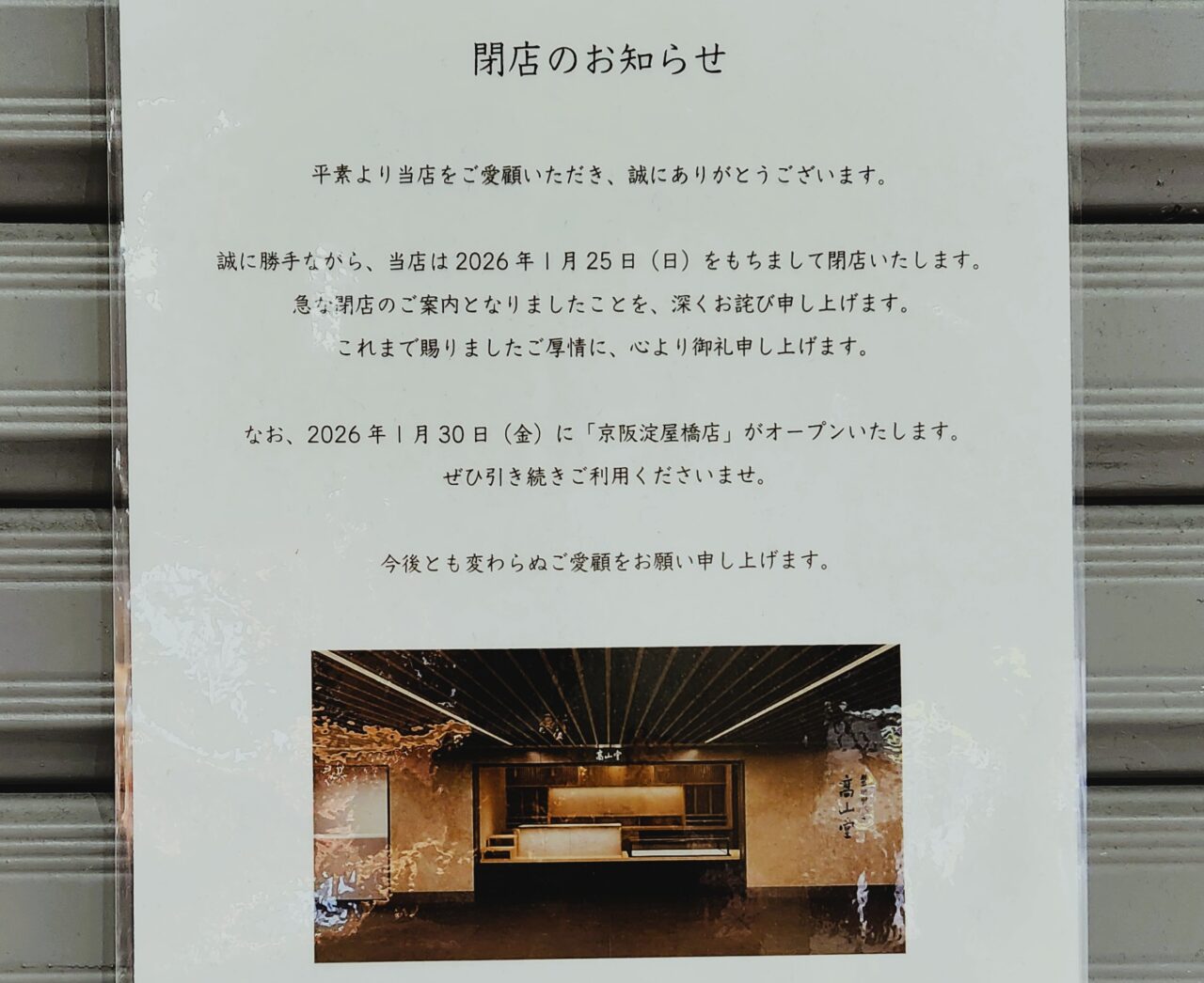 JR新大阪駅3階改札外の目立つ場所にあった和菓子やこだわりの洋菓子のお店『髙山堂 甘継新大阪店』が閉店しています。
