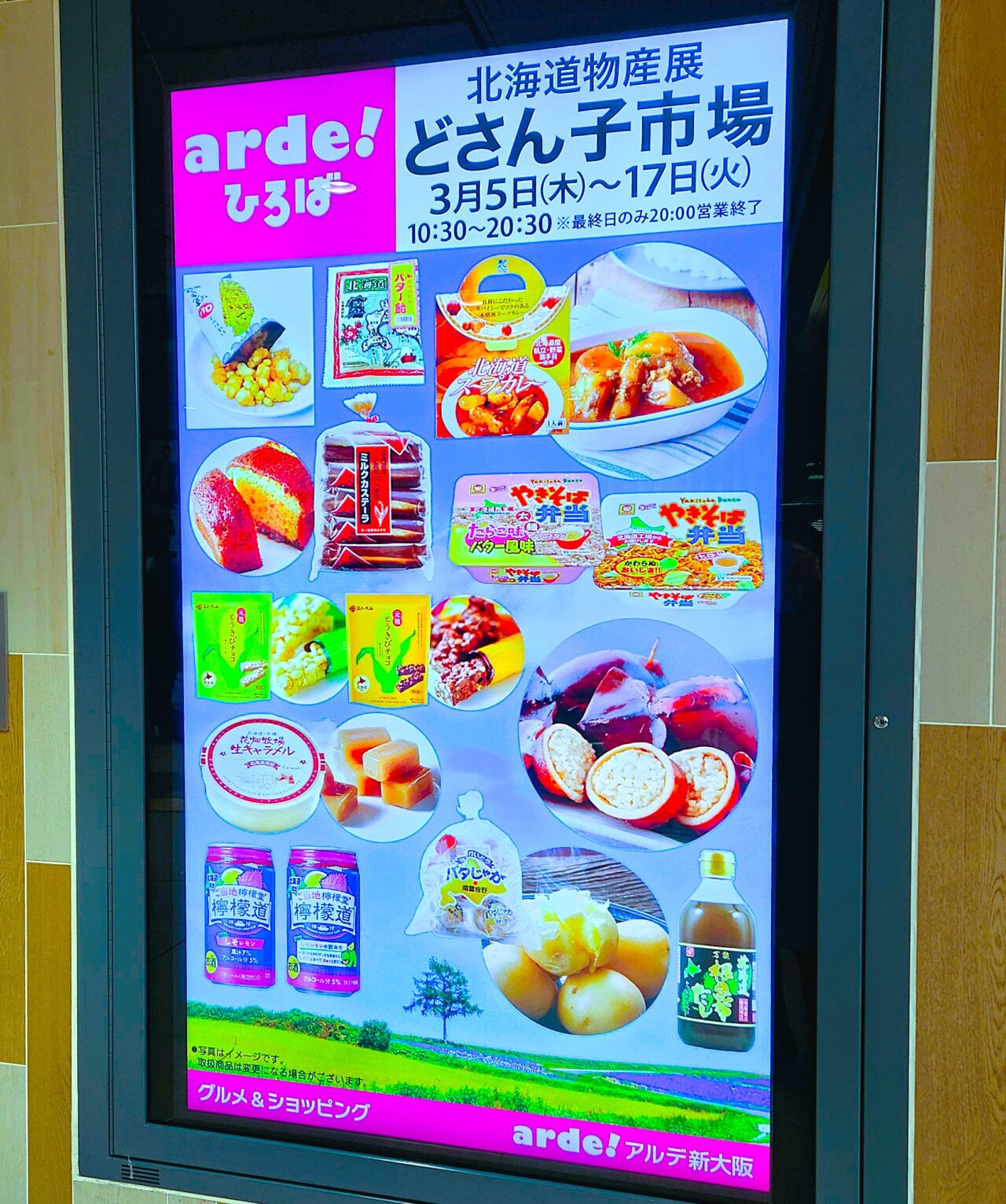 こちらは「アルデ新大阪」のあちこちに設置されているデジタルPOPです。行ってみたいと思わせる人気商品が色々載っていますね。