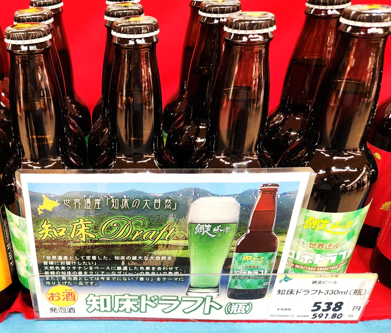 知床のクチナシを着色に使用したクリアなグリーンカラーの「知床ドラフト」(発泡酒)。