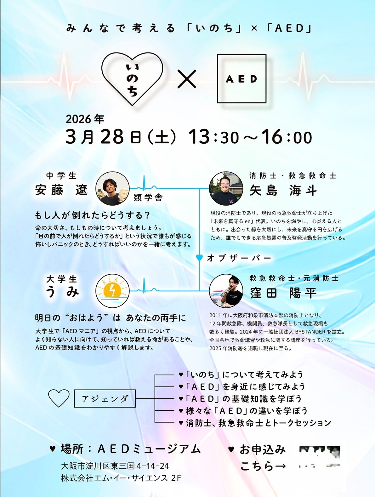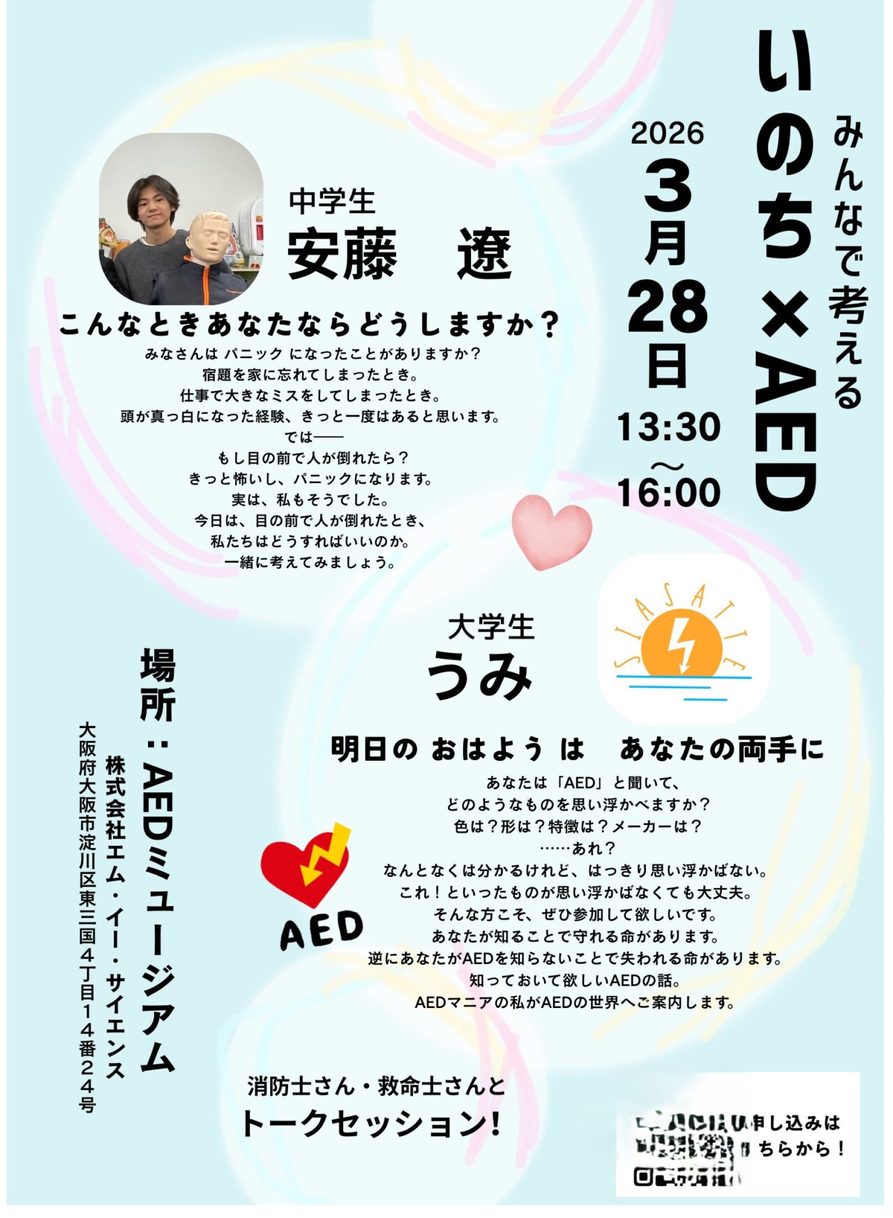 【大阪市淀川区】東三国「AEDミュージアム」で、ワークショップ『みんなで考える“”いのち」×「AED」ワークショップ』3月28日(土)開催!中学生と大学生が一緒に企画したもの。プロの救命士・消防士がサポートします。