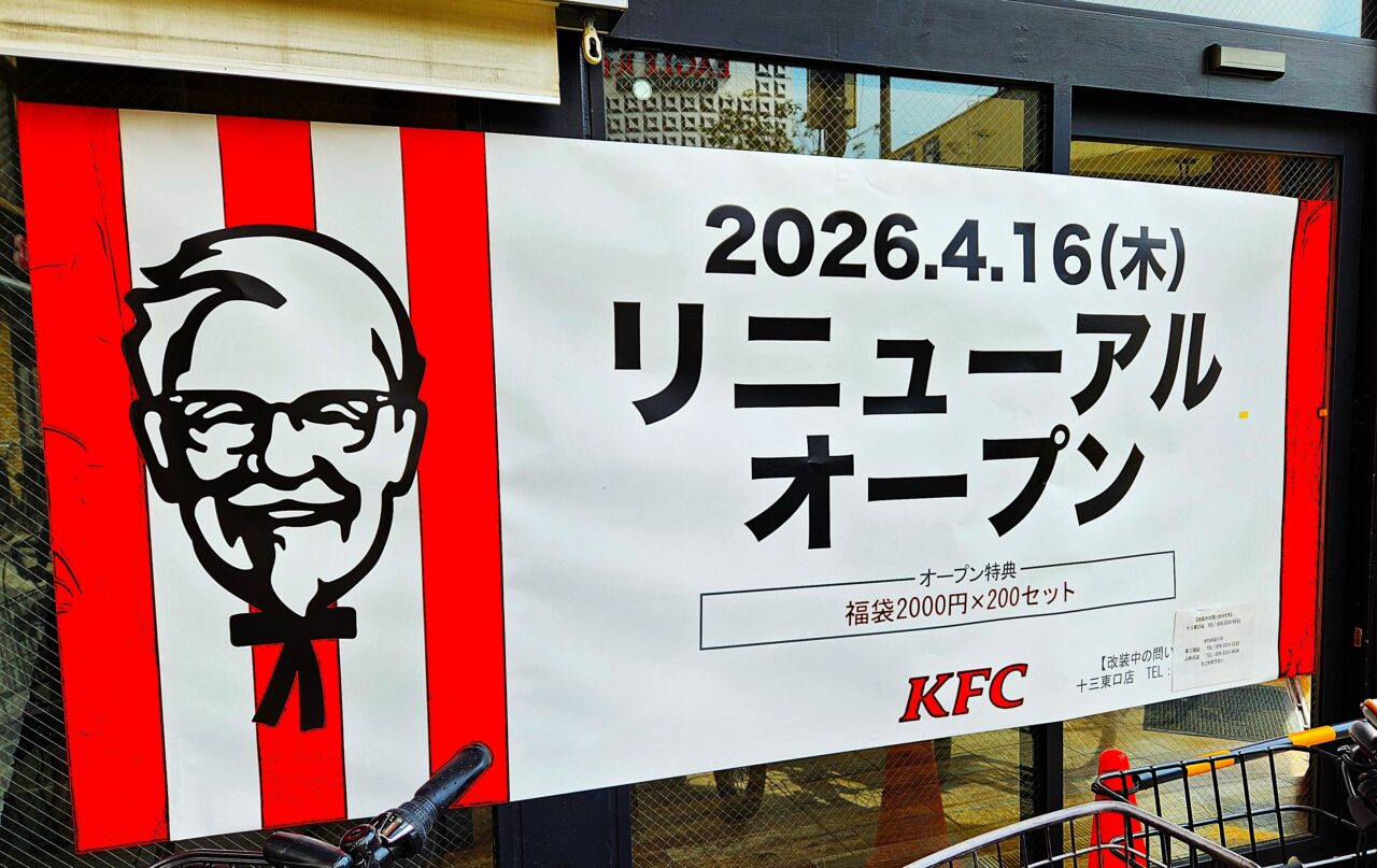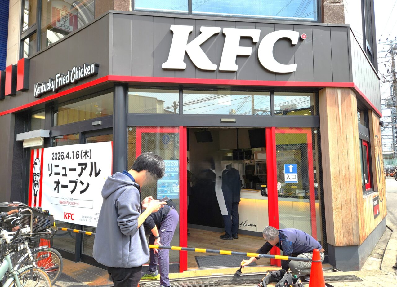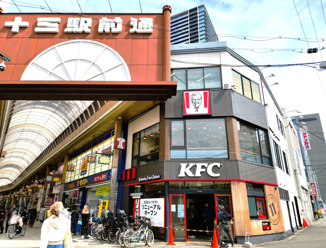 阪急十三駅東口改札を出てすぐの場所にある『ケンタッキーフライドチキン十三東口店』。リニューアルの為一時休業していましたが、いよいよ2026年4月16日(木)にリニューアルオープンします。