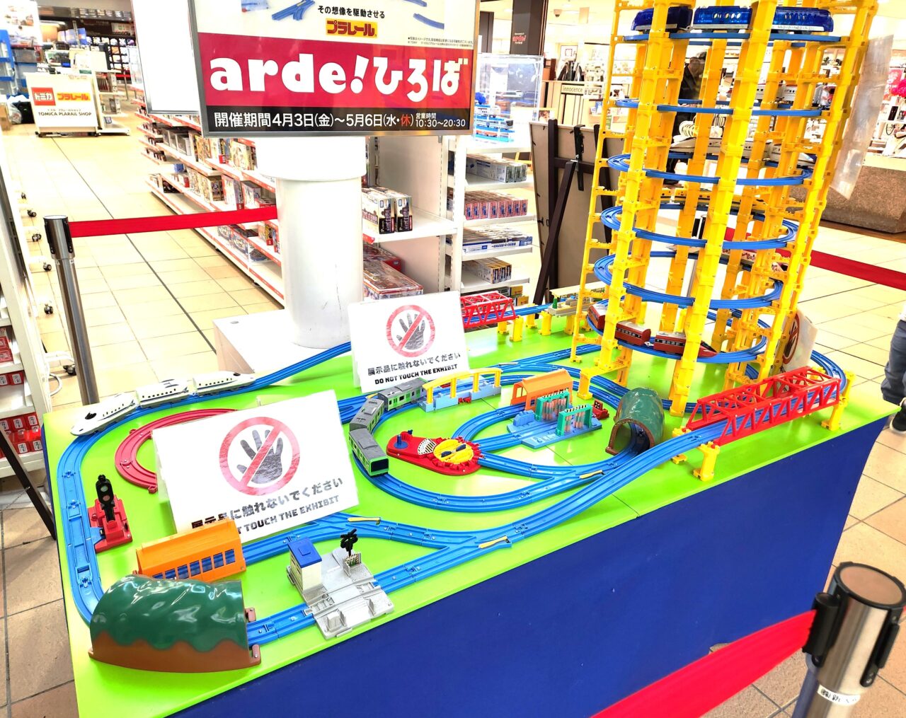 正面入り口には立体的な模型が設置され、元気にプラレールが走っていました。