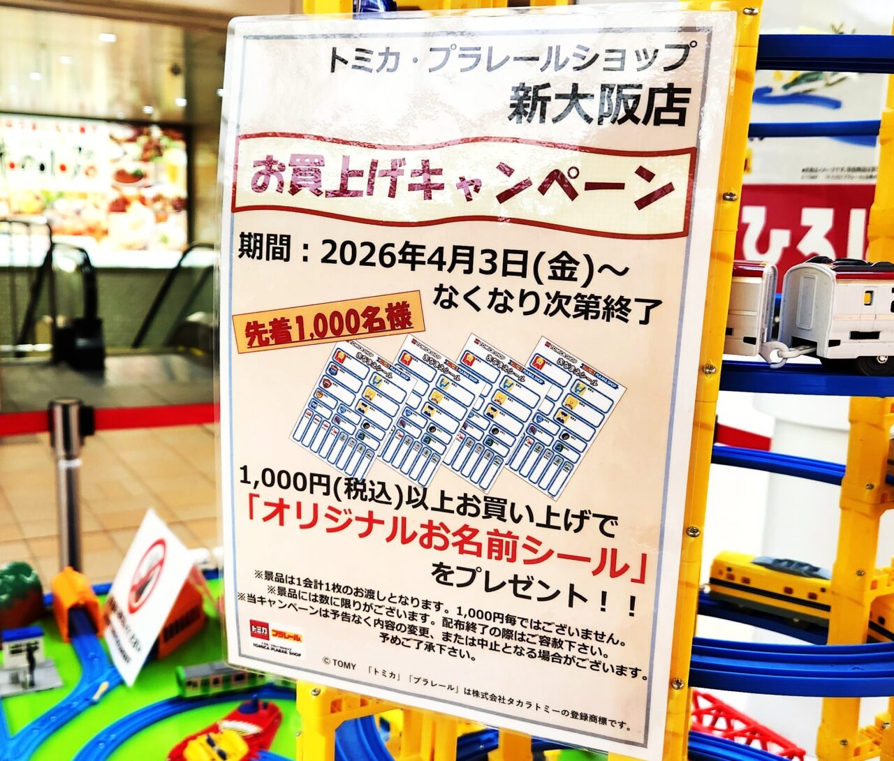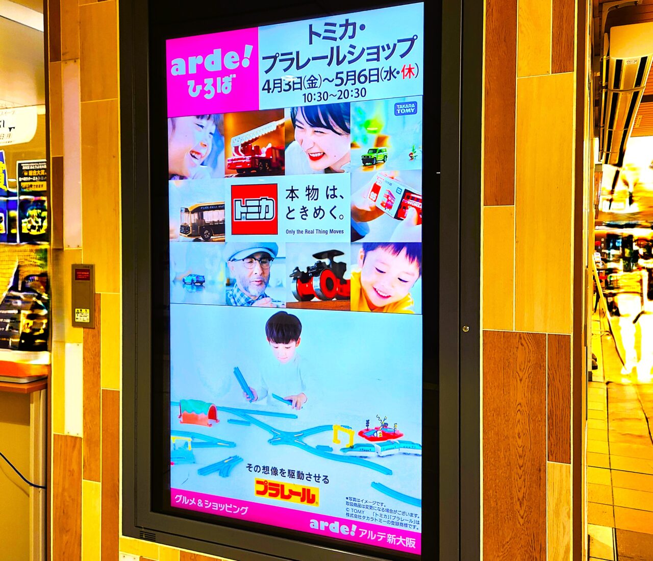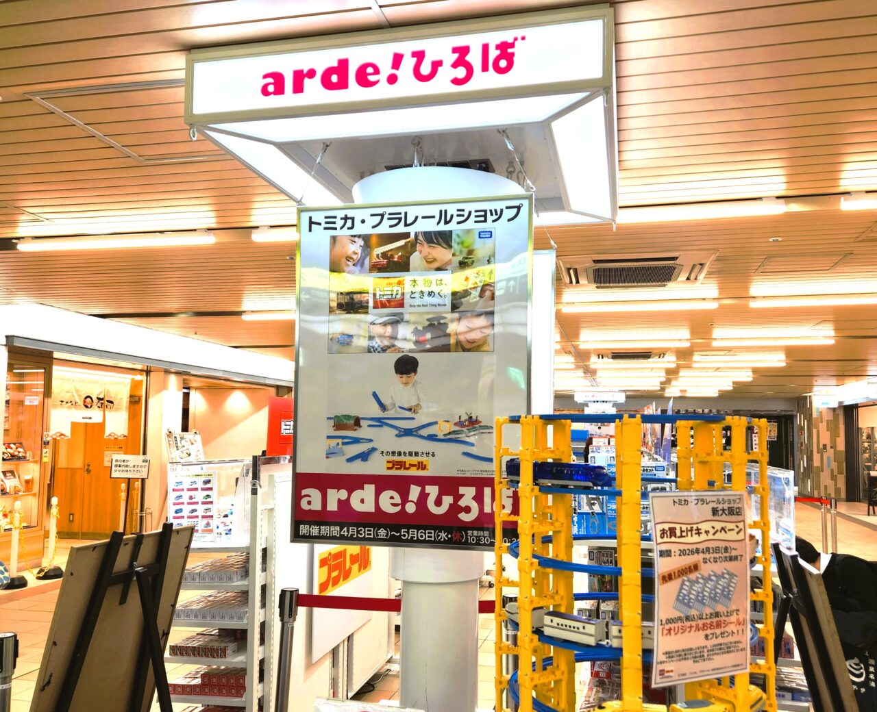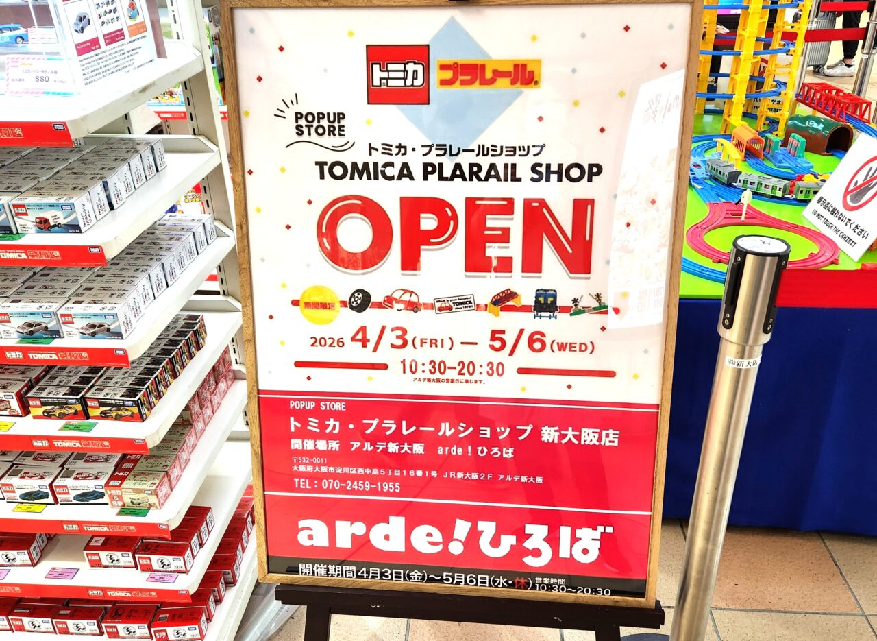 JR新大阪駅2階・アルデ新大阪の催事スペース「新大阪アルデひろば」で、期間限定ショップ『トミカ・プラレールショップ』が開催されています。実施期間は2026年4月3日(金)~5月6日(水・祝)。実際に訪れてみました。こちらは道行く人にアピールしている会場横のデジタルPOPです。