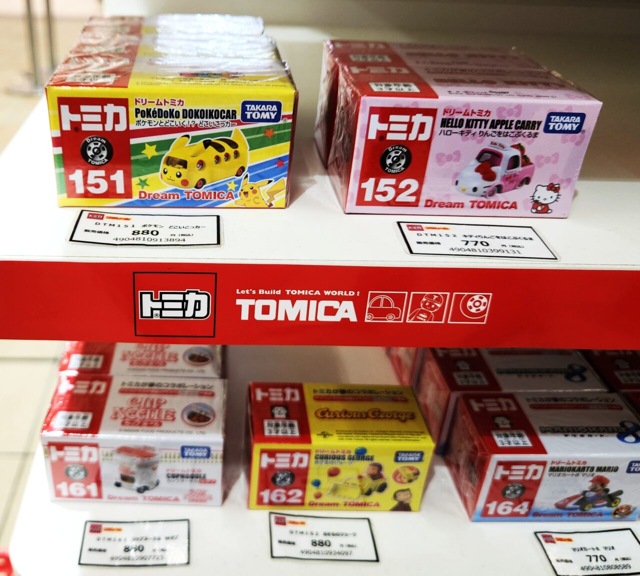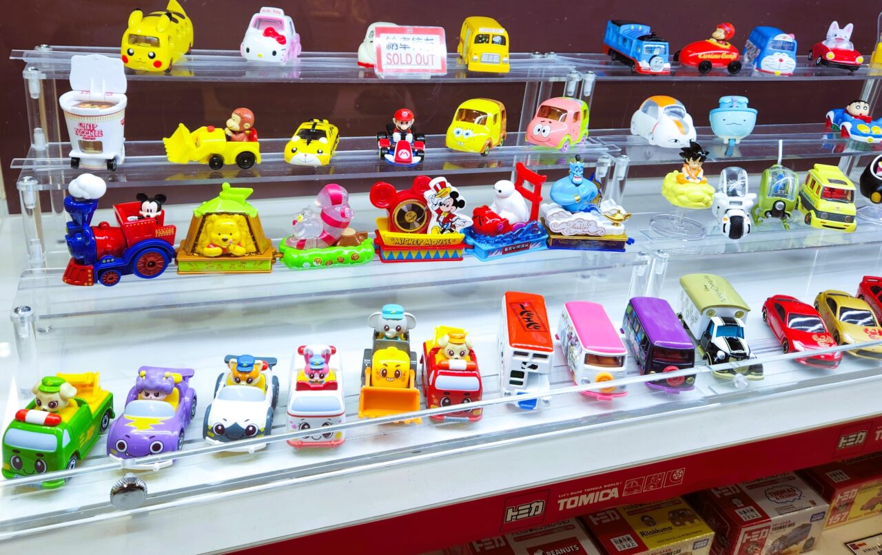 ポケモンやドラえもん、キティちゃん等の人気キャラクターのオリジナルデザインもの「ドリームトミカ」が色々。可愛いですね。